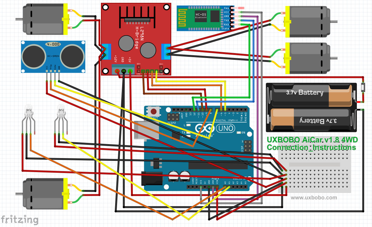 UXBOBO 精選四輪 DIY 智能模型車 v1.8b 【Arduino UNO 智能控制/編程入門套裝】 以 DIY 重組裝設計智能四驅車為主題; 讓您用簡單有效的方法,快速地去利用手機藍牙功能與 ( Arduino UNO 等 ) 微型控制器及相關傳感器,進行更有趣好玩實用的人機互動設計控制體驗. 此電子模型套裝同時可以是個 DIY 智能科學入門任務之一 : 在全球開源的物聯網設計項目及創客自由使用系列的硬件之間,搭建一個由您完全掌控的智能傳感器/機械控制平台.